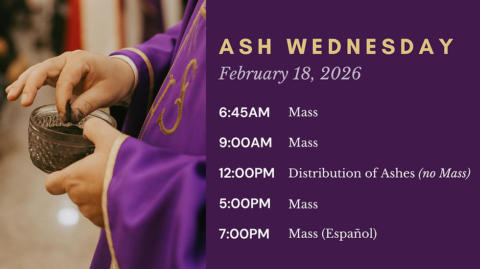 Lent begins on Wednesday, February 18th. Our Ash Wednesday schedule will include Mass at 6:45am, 9:00am, 5:00pm, and 7:00pm (Spanish), with a service for the distribution of ashes (no Mass) at 12:00pm.